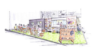JR福山駅(広島)にある旧駅前交番跡地を活用した賑わい作りとして、アサイーボールやグリークヨーグルト、バナナジュースなど、キッチンカーによる出店の様子を描かせていただきました🍹