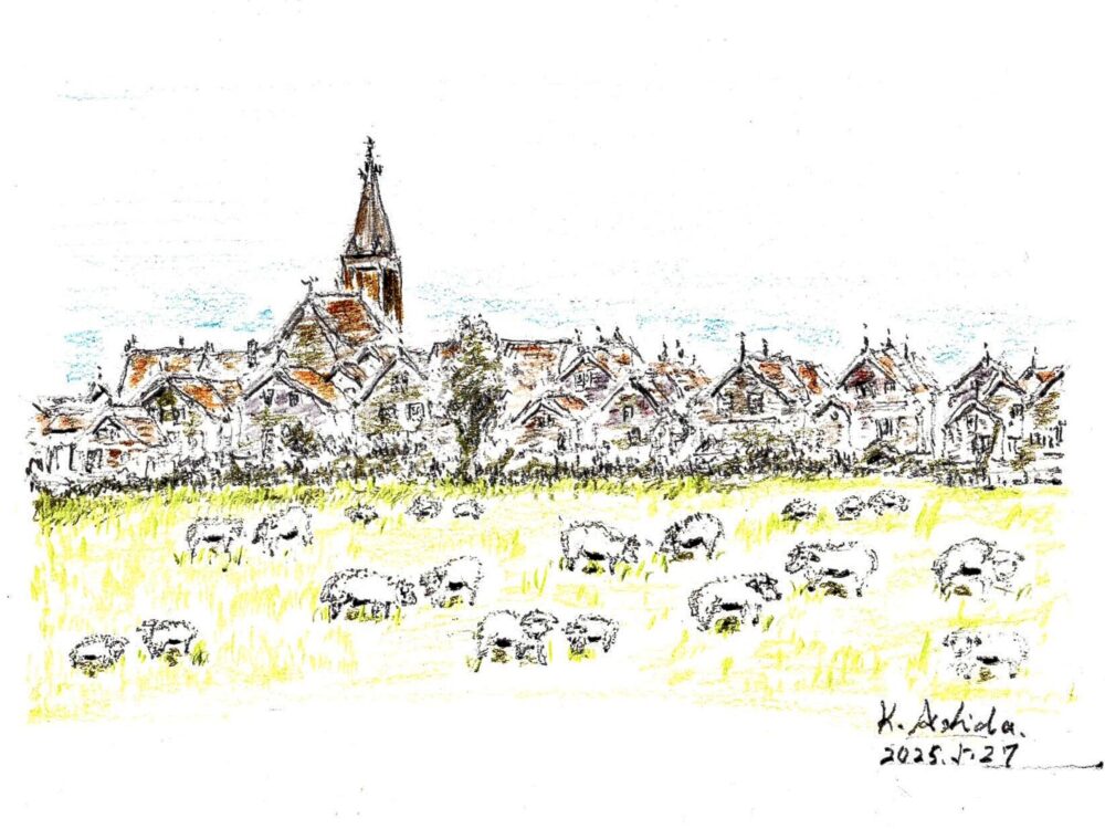 点景としておひつじさんたちを賑わいよく描き入れながら