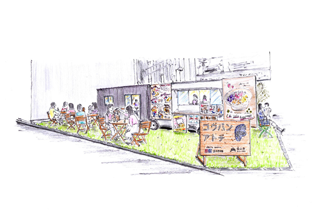 この度、JR福山駅(広島)にある旧駅前交番跡地を活用した賑わい作りとして、アサイーボールやグリークヨーグルト、バナナジュースなど、キッチンカーによる出店の様子を描かせていただきました🍹