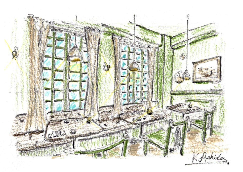 先日、生徒さまと一緒に完成させた京都レトロ喫茶「雲の茶カフェ」のスケッチをご紹介✏
