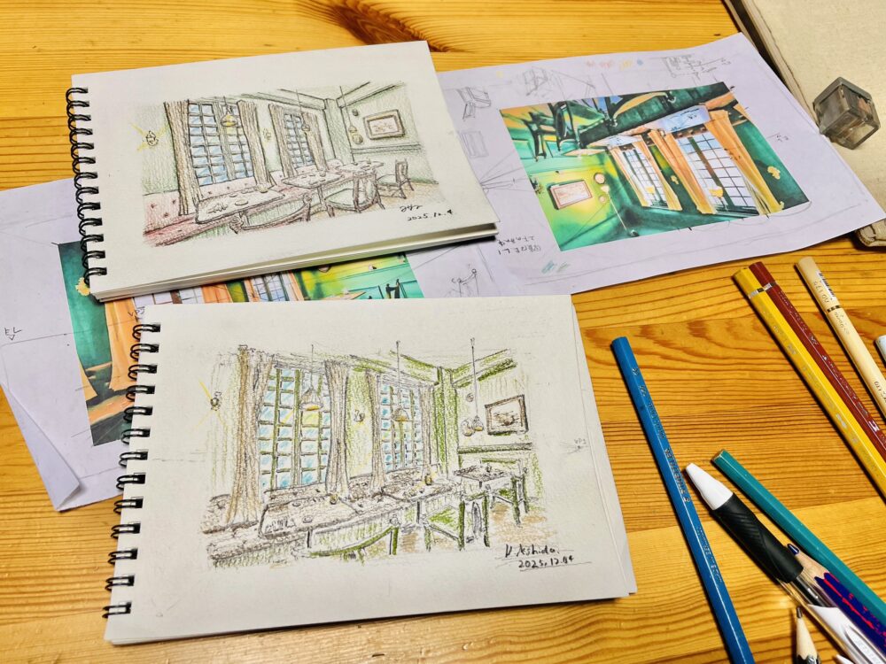 そしてスケッチは、鉛筆と紙だけで立体物、空間を表現し視覚的に相手に伝えることができるため非常にコスパの良い強力なツールになります。